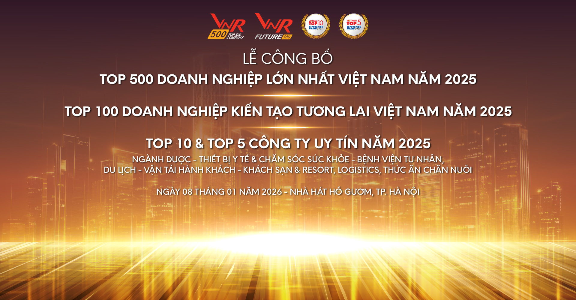 Sau gần hai thập kỷ kiên định với sứ mệnh tôn vinh sức mạnh doanh nghiệp Việt, Bảng xếp hạng VNR500 & TOP 10 Công ty uy tín các ngành không chỉ là sự tiếp nối truyền thống ghi nhận những “đầu tàu” kinh tế, mà còn phản ánh hành trình vươn tầm ảnh hưởng của cộng đồng doanh nghiệp Việt Nam trong chuỗi giá trị toàn cầu. Đây cũng là năm đầu tiên Bảng xếp hạng VNR FUTURE 100 được công bố, ghi danh những tên tuổi đang định hình tương lai Việt Nam bằng tri thức, công nghệ và trách nhiệm xã hội. Lễ công bố Bảng xếp hạng VNR500 - VNR FUTURE 100 & TOP 10 Công ty uy tín năm 2025 sẽ được tổ chức vào ngày 08 tháng 01 năm 2026 tại Nhà hát Hồ Gươm, TP. Hà Nội.